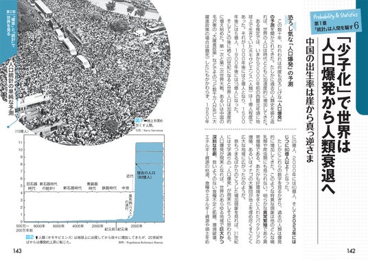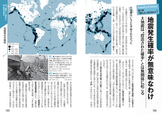 また、本書後半の「確率」と「統計」では現実社会の数学を扱います。人工知能から人口統計でみる少子化、大地震発生の確率まで、まさに現在進行形の数学を紹介しています。