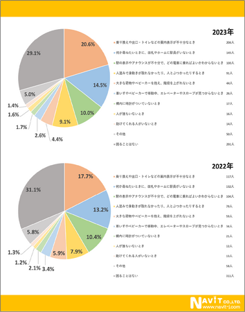 「乗り換えや出口・トイレなどの案内表示が不十分なとき」が17.7%→20.6%と2.9%増えています。次に「何か尋ねたいときに、改札やホームに駅員がいないとき」が13.2%→14.5%と増えていますね。予算の都合などで無人駅が増えている影響でしょうか。「駅の表示やアナウンスが不十分で、どの電車に乗ればよいかわからないとき」が10.4%→10.0%と若干の改善を見せています。駅員を減らす代わりに表示方法が改善されているのでしょうか。
