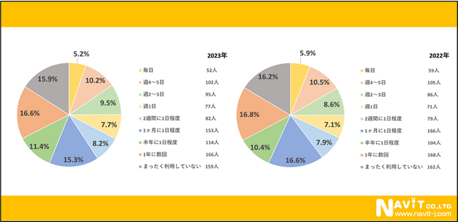 駅をどのくらい利用しているかとの最新の調査では「1年に数回」が16.6%、「全く利用していない」が15.9%、「1ヶ月に1日程度」が15.3%という結果になっています。前年の調査からの数値の変化は微差と言っていい程度の差になっていますが、「全く利用しない」が16.2%→15.9%と下がり「1ヶ月に1日程度」が16.6%→15.3%と変化しています。前年からの社会的変化としてはコロナ禍からアフターコロナに変わりつつある時期なので駅の利用者が増えたのかもしれません。