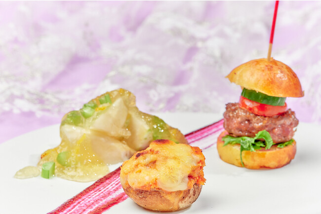 シャンピニオンと牛すじ肉のグラタン・蕪のピクルスと柚子のジュレ・自家製プチバーガー