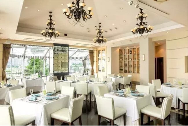 横浜駅から徒歩7分。結婚式場「横浜 アートグレイス ポートサイドヴィラ」3階の空中庭園に佇む、水上に浮かぶペントハウスレストラン。大きな窓から横浜の海と空を大パノラマで眺めながら、イタリア各地の伝統的な料理をシェフがアレンジした、視覚でも楽しめるイタリアンをご堪能いただけます。