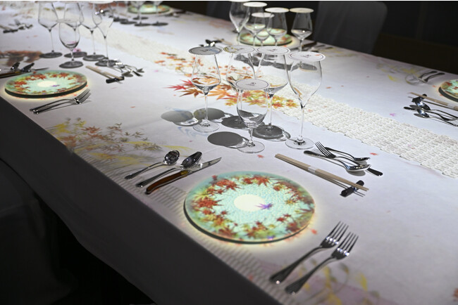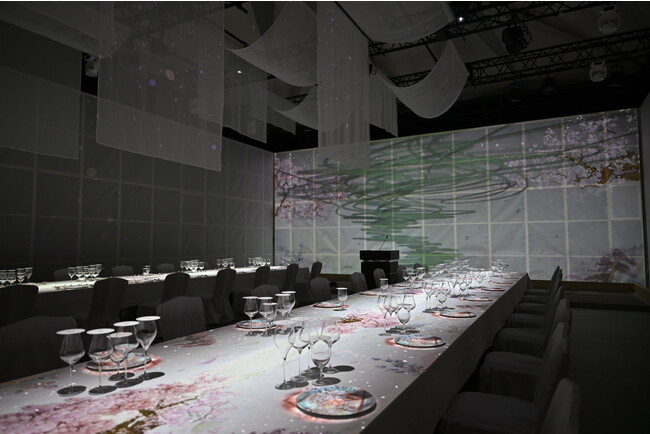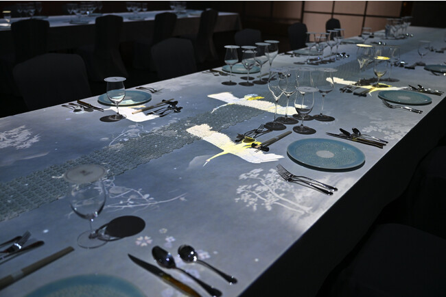 夕食を通じて、平和のシンボルともいえる鶴が渡り鳥に姿を変えて、夕食会場の壁一面を羽ばたかせながら、お料理が進むごとに日本の美しい四季をデジタルアートとメニューで紹介しました。日本の「和」の心とおもてなし、「平和」への願いを感じていただきました。
