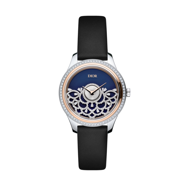 夜空のダークブルーとダイヤモンドの白い輝きのコントラストがムッシュ ディオールが魅了された社交界の舞踏会を彷彿とさせます。ムッシュ ディオールは、こよなく愛したダークブルーを黒に代わる色と信じ、その深みのある色合いは、フェミニンなオーラを映し出します。文字盤の上を華やかに舞うローターには、オープンワークデザインとダイヤモンドで表現された「デンテル(フランス語でレースの意)」の装飾が施されています。クチュールに用いられる繊細なレースさながらに、軽やかに、また、エレガントに揺れ動き、ブリリアントカットとペアカットのダイヤモンドの輝きに溢れます。