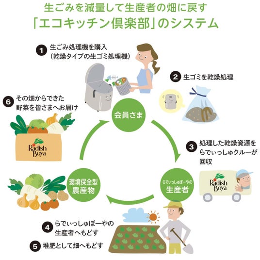 らでぃっしゅぼーやでは、2001年からご家庭の野菜くずを畑に循環させる「エコキッチン倶楽部」の取り組みを続けています。(右図)各ご家庭で設置いただいた専用の乾燥機で処理した野菜くずの生ゴミを、定期会員様から回収して契約生産者に戻し、そこで加工された有機肥料を使って栽培された農産物を、再び定期会員様にご購入いただき、召し上がっていただくというエコロジカルな仕組みです。
