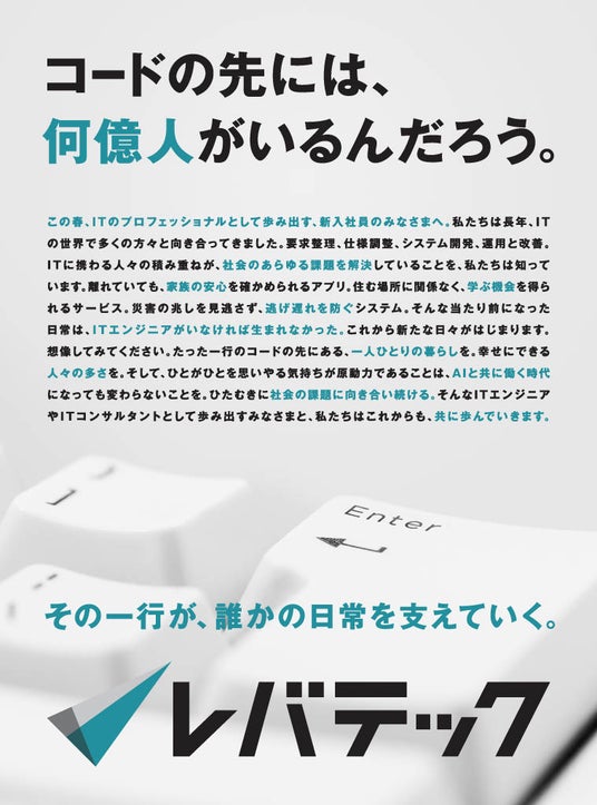 「日本を、IT先進国に。」をビジョンに掲げるレバテック株式会社( https://levtech.jp/ )は、2026年3月31日(火)の日本経済新聞(全国版)にて、ITエンジニアとして社会人の第一歩を踏み出す新入社員に向けたメッセージ広告を掲載します。