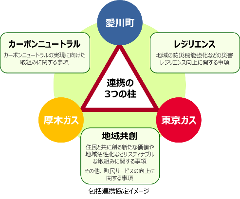 愛川町(町長:小野澤 豊)、厚木ガス株式会社(社長:佐々木 孝、以下「厚木ガス」)、東京ガス株式会社(社長:笹山 晋一、以下「東京ガス」)は、このたび、「持続可能なまちづくりに向けた包括連携協定」(以下、「本協定」)を締結しました。