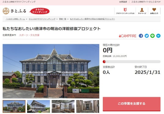 佐賀県唐津市とふるさと納税ポータルサイト「さとふる」を運営する株式会社さとふる(本社:東京都中央区、代表取締役社長 兼 CEO:藤井 宏明)は、「さとふるクラウドファンディング」にて、「私たちなおしたい!唐津市の明治の洋館修復プロジェクト」の寄付受け付けを2024年10月4日より開始します。