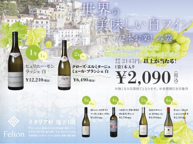 NSGグループの愛宕商事株式会社(本社:新潟県新潟市、代表取締役:高橋克郎)が運営する輸入ワイン販売店「Felion(フェリオン)」にて、白ワインお楽しみ袋(1袋1本入り 税込:2,090円)が9月20日(火)より72本限定で販売されます。
