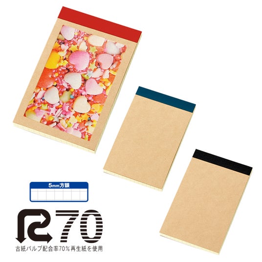 本文には5mm方眼用紙を採用しており、文字だけでなく図やラフスケッチも書きやすい仕様。再生紙ならではのやさしい風合いと落ち着いたカラーが特徴で、環境にも配慮したアイテムです。古紙パルプ配合率70%のR70マーク取得製品で、サステナブルな取り組みにも貢献します。