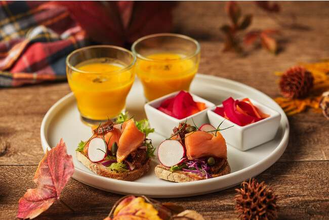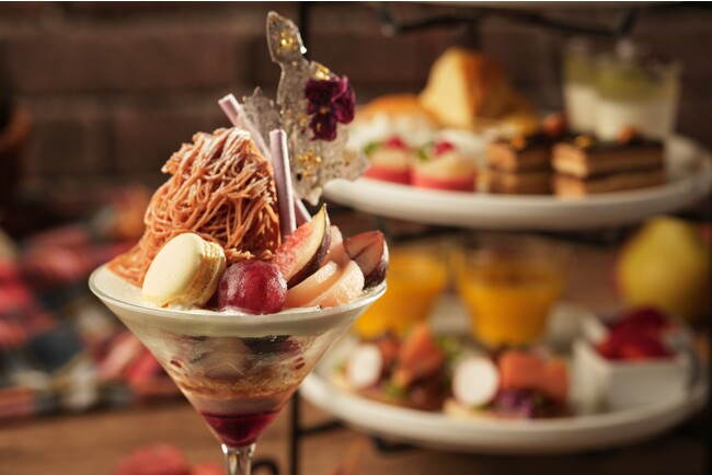 ミニサイズのモンブランやかぼちゃのマカロン、洋ナシとキャラメルの一口タルト、りんごの形のムースなど、旬の食材を使った贅沢なスイーツに加え、イチジクがアクセントになったサーモンのオープンサンドやスープなどの軽食と、2種のスコーンをご堪能いただけます。中でも注目は、スタンド1段目にあるお芋パフェ。手のひらサイズの器に入ったプチサイズながら、ほうじ茶プリン、サツマイモの甘露煮、紫芋のクランブル、お芋チップスが入り、2種類のお芋の甘みとほうじ茶の香り、パリパリ・サクサクとした食感の違いをお楽しみいただける、パティシエこだわりの仕上がりです。