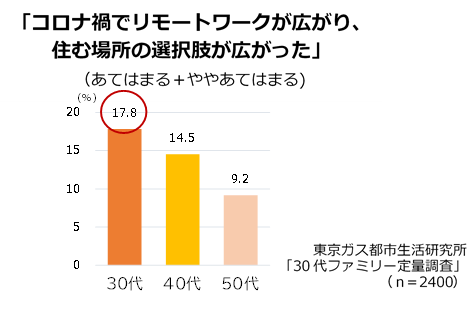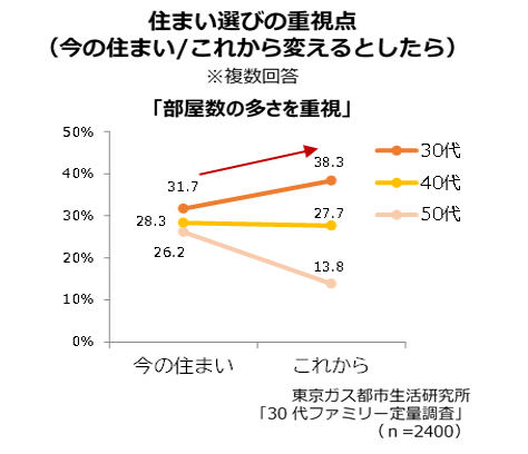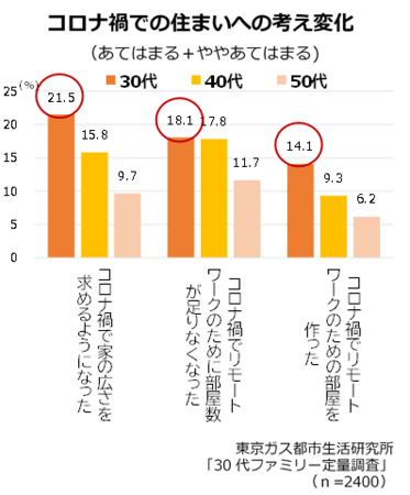 コロナ禍の影響でリモートワークが増加し、「住む場所の選択肢が広がった」と感じられる一方で、仕事のために部屋数が足りないと感じる人も多くいました。部屋数や全体的な広さを求める傾向は、上の年代よりも30代ファミリーで強くなっています。住まい選びも、「部屋数の多さ」がこれまでよりも重視されています。