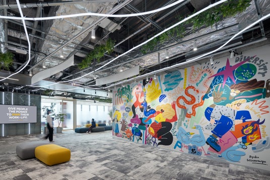オープンラウンジにはAV機器も完備し、セミナーや交流会などのイベントも開催。壁面アートはヘラルボニー社によるもの。