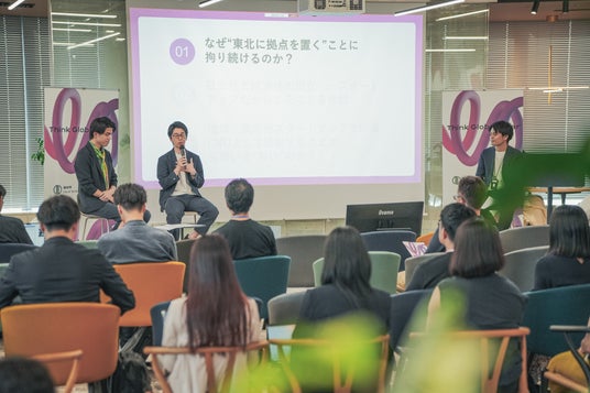副業・フリーランス人材と企業をマッチングする「HiPro」事業の一環として、東北のスタートアップ企業とをつなぐイベントを開催。オープンラウンジでの企業ピッチと並行し、会議室等を活用した企業と個人との個別面談や、グループディスカッションを実施。(2025年8月、オープンラウンジにて開催)