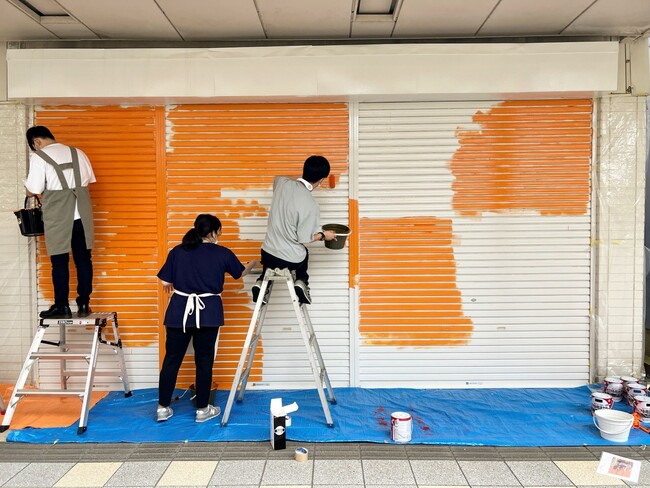 作業は3日間にわたり、ペンキの色を混ぜ何色も色を作り、イラストのバランスが崩れないようにパネルなどを使用しながら、A4サイズのイラストだったものがだんだんと巨大なイラストになっていきました。完成した店舗シャッターは、とてもクオリティが高くさすがデザイン専門学校の生徒さんだなと思わせてくれるものとなりました。全体的に深い色合いで構成されたイラストは夜のスポットライトにもとても映える作品となっており、これから上古町を歩く多くの方に見て楽しんでいただけることを願っております。