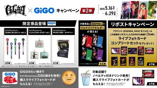 株式会社GENDA GiGO Entertainment(本社:東京都港区 代表取締役社長:二宮 一浩 以下、「当社」)は、GiGOグループのお店におきまして、2025年5月31日(土)より30周年のグランドフィナーレとしてドームツアーを実施する人気ロックバンド『GLAY』とのコラボレーションキャンペーン第2弾を開催いたします。