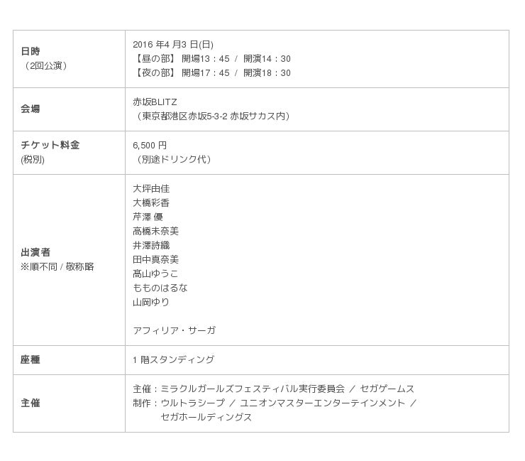 株式会社セガゲームス コンシューマ・オンライン カンパニーは、2016 年 4 月 3 日(日)に赤坂 BLITZ にて開催する「ミラクルなガールズのフェスティバル」出演者情報第一弾を公開いたしました。