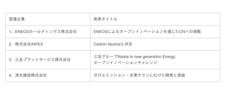 関東経済産業局が開催する「カーボンニュートラル分野オープンイノベー ション・ チャレンジピッチ」では、ENEOSホールディングス株式会社、株式会社INPEX、三友プラントサービス株式会社、清水建設株式会社の4社がCN分野の具体的な技術開発ニーズについて発信します。