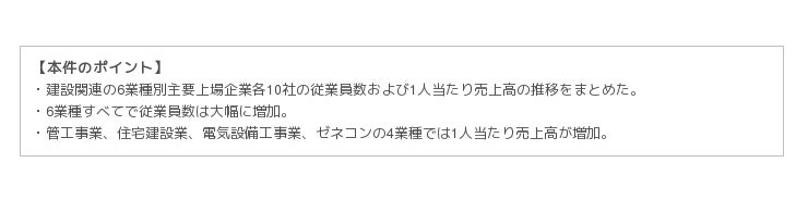 各社の2019年3月期の有価証券報告書を見ると、建設投資の拡大を背景として、6業種すべてで2015年に比べて従業員数が増加しています。増加率が最も高いのは電気設備業の24.0%で、次いで土木工事業の18.4%、住宅建設業の16.7%、管工事業の11.3%、ゼネコンの10.7%の順となり、プラントエンジニアリング業を除く5業種で2ケタの伸び率となっています(図表1.)。6業種の各主要10社の従業員数を合計すると、15年3月期の318,222人から19年3月期には365,972人へと増加しており、4年間で47,750人の新たな雇用が生まれたことになります。