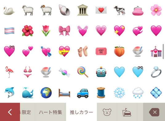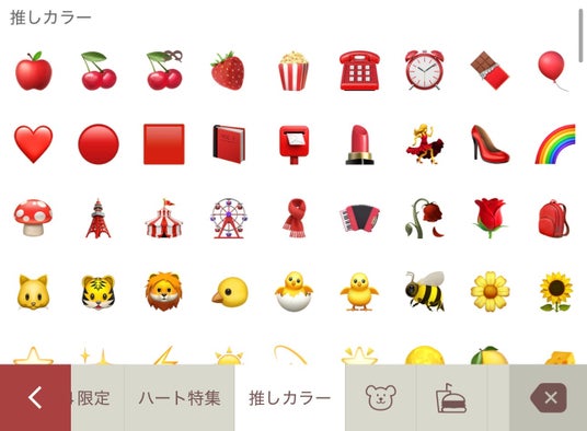 Simejiには、好きな色ごとに絵文字を一覧表示できる「推しカラー絵文字」タブがあり、SNS投稿や応援メッセージを一気に華やかにしてくれます。
