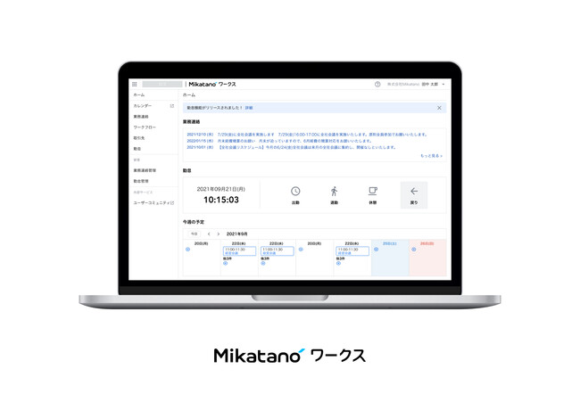 『Mikatano ワークス』は、金融機関を通じて、金融機関の顧客に当社が提供する、DXを支援するためのサービスです。コミュニケーションツール、ワークフロー、勤怠管理などのグループウェアをはじめとした日常業務に活用できるデジタルサービスが、簡単かつ直感的なUI/UXで搭載されています。IT担当者の不在などでDXが進んでいない企業でも簡単に安価で利用することができ、業務のデジタル化の第一歩を進めていくことができるサービスです。