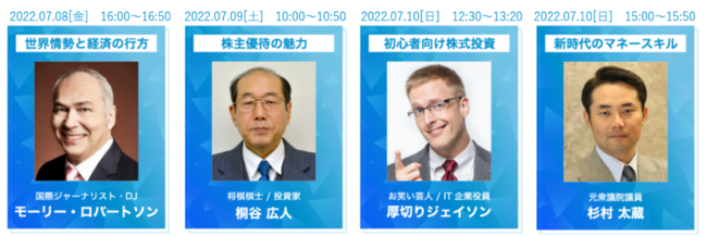 【モーリー・ロバートソン氏/杉村太蔵氏/桐谷広人氏】などメディアでも注目されている講師が多数登壇予定。【経済・株式投資・不動産投資・FX・相続…】など多様なテーマで講演する。