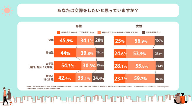 ・「自分からアプローチしてでも交際したい」と答えた若者は、「男性」では45.9%、「女性」では25.0%。「男性」と「女性」で傾向が分かれる