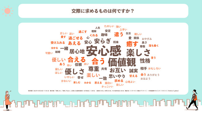交際に求めるものを自由回答で聞いたところ、若者から最も多く挙がったワードは「安心感」でした。続いて「価値観の一致」となり、具体的には「金銭感覚が合うこと」や、「趣味に理解があること」などに言及していました。その他には、「一緒にいて楽しい」「お互いを尊重し合える」「優しさ」が交際に求めるものとして挙がりました。