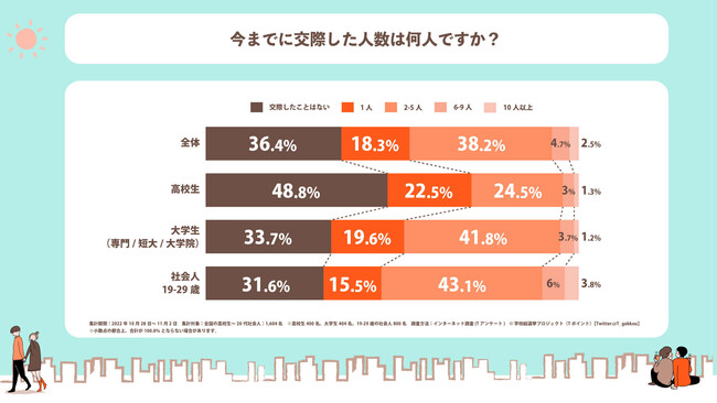 現在、交際している恋人がいるかどうかを聞いたところ、「恋人がいる」と回答した人が25.8%、「恋人はいない」と回答した人が74.2%となりました。属性別で見ると、「高校生」では交際している人の割合が「大学生」や「社会人」の約半数であることが分かります。また、今まで交際をした人数を聞いたところ、「交際したことはない」と回答した人が36.4%となり、若者の交際未経験率が約4割に上ることが分かりました。