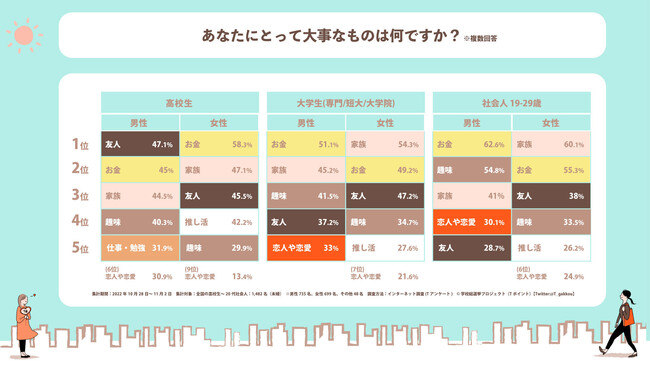 一方、アイドルやキャラクターなど、自分にとってのイチオシを応援する活動として知られる「推し活」については、「高校生」「大学生」「社会人」の「女性」において、いずれもTOP5に入り、「恋人・恋愛」よりも「推し活」の優先順位が高いことが明らかになりました。