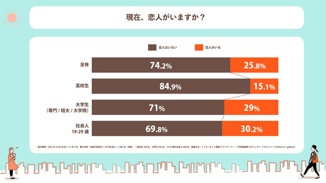「恋人として交際している相手がいる」若者は、25.8%。交際未経験率は36.4%。