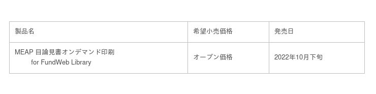 キヤノンマーケティングジャパン株式会社(代表取締役社長:足立正親、以下キヤノンMJ)は、銀行、証券会社向けに個別に構築してきた「目論見書オンデマンド印刷システム」と導入サービスをパッケージ化し、“MEAP 目論見書オンデマンド印刷 for FundWeb Library”として提供を開始します。MEAP※1アプリケーションと安定稼働を可能にする導入サービスを提供することで、全国の投資信託業務を担う金融機関のDXを支援します。