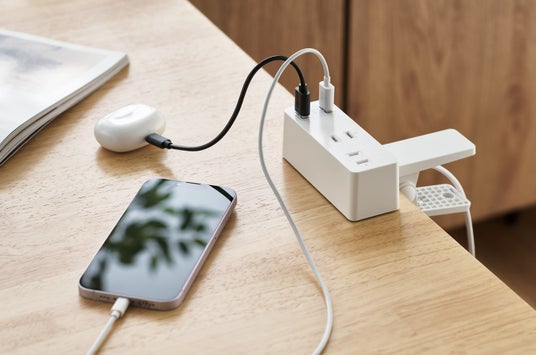 机などに挟んで使えるクリップ機構を搭載した、USB-Aポート付きの電源タップです。タップを常設できないダイニングテーブルなどにも一時的に電源を設置できます。