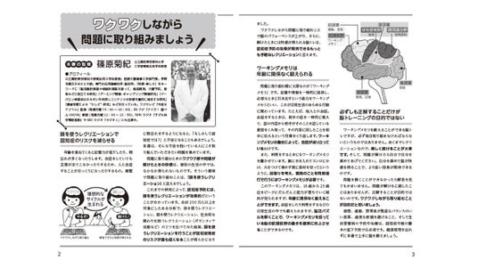脳の中で記憶や情報を一時的に保持し、必要な時に引き出す能力のことをワーキングメモリと呼んでいます。この機能は18歳から25歳をピークにだんだんと衰えていきますが、脳活パズルに取り組むことで年齢に関係なく鍛えることができると言われています。問題が解けたときには快感が得られる脳トレは、認知症予防の効果が期待できるもっとも手軽なレクリエーションともいわれています。
