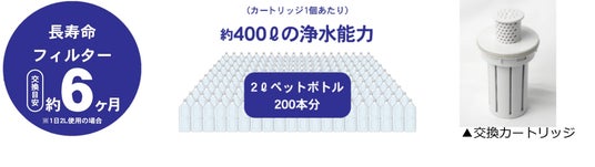 カートリッジ1個あたりで約400L相当(2Lペットボトル200本分)の浄水能力を持つ長寿命フィルターを搭載。カートリッジ交換目安は約6か月のため、1年間に2回の交換で済みます。
