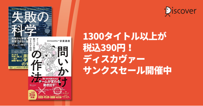 売れ筋書籍やロングセラーを含む、ディスカヴァーの電子書籍1300タイトル以上が、1冊390円とかなりお得に買えるチャンスです。