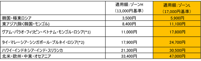 運賃額 : 日本発旅程 (金額はお一人さま一区間片道あたり)