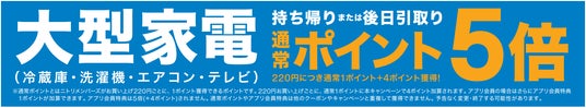 期間中は、冷蔵庫・洗濯機・テレビ・エアコンなどの大型家電を、ご自身でお持ち帰りいただいたお客様に(後日引き取り含む)、ご購入いただいた大型家電の通常ポイントが5倍になるお得なキャンペーンとなっています(※3)。