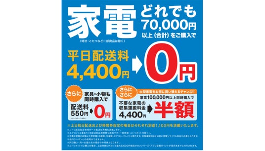 また、家電(時計・こたつなど一部商品は除く)を税込み合計100,000円以上ご購入いただくと不要な家電の収集運搬料金(通常4,400円(税込))が半額となります。(※1)