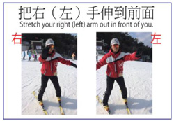「訪日外国人旅行者向けスキースクール」では、フレーズ(英語+中国語<繁体字>)と写真入りのPOPを用いて、ブーツや板の履き方から自分の意思で止まれるようになるまでを目指します。