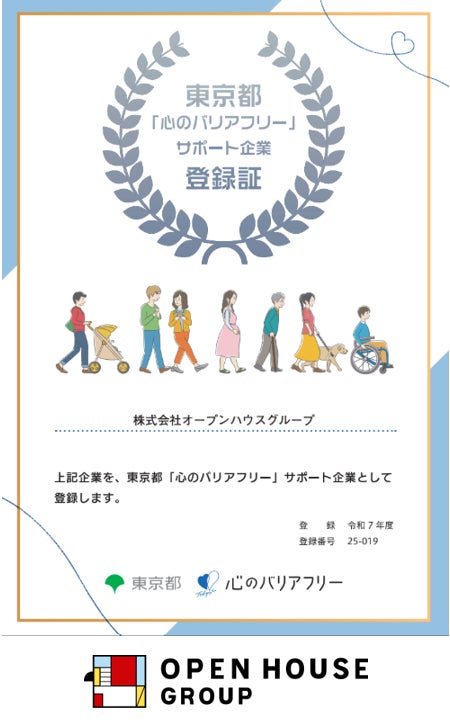株式会社オープンハウスグループ(本社:東京都千代田区、代表取締役社長 福岡 良介、以下「当社」)は、東京都より「東京都『心のバリアフリー』サポート企業」に登録されましたので、お知らせいたします。当社は、「やる気のある人を広く受け入れ、結果に報いる組織を作ります」という企業理念のもと、従業員一人一人の人権を尊重し、性別、年齢、国籍等の属性にとらわれない多様性を活かした組織づくり・働きやすい職場環境づくりに努めております。