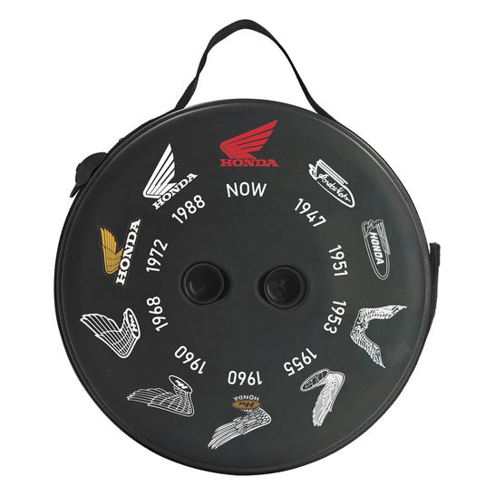 1953年から現在に至るまで、Hondaの歴代ウィングロゴの変遷を一面にあしらった折り畳みスツールは本田技研工業の正式ライセンスを取得した公認アイテム。