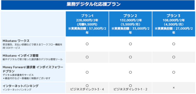 IT導入補助金の補助対象となるのは、マネーフォワードが四国銀行を通じて提供する『Mikatano』シリーズがまれた「業務デジタル化応援プラン」と、マネーフォワードとパーソルが連携して行う「導入・活用サポート」です。四国銀行の顧客企業が、「業務デジタル化応援プラン」「導入・活用サポート」を導入する際は、導入費用について補助金を申請することが可能です。申請した企業に対して補助金の交付が決定すれば、より安価(最大2年間、導入費用の75%が補助金として交付されます。)にこれらのサービスを導入することができます。申請のお申し込みは、9月26日より受付を開始いたします。