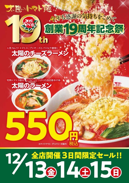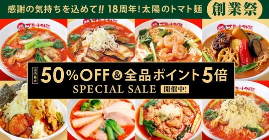 トマトの旨味を凝縮したラーメンが人気の「太陽のトマト麺」は、2024年12月に創業19周年目を迎えます。これを記念し、日頃のご愛顧への感謝を込めて、毎年恒例となっている「創業19周年記念祭」を、今年は期間を3日間に延長して開催いたします。期間中、国内の太陽のトマト麺全店舗にて、定番メニューの『太陽のラーメン』および『太陽のチーズラーメン』を一律550円(税込)で提供いたします。さらに今年は、公式ECサイトでも「創業祭 SPECIAL SALE」を同時開催いたします。期間中、店内最大50%オフに加え、全品ポイント5倍でお買い求めいただけます。年に一度の特別なキャンペーンで創業祭を盛り上げます。