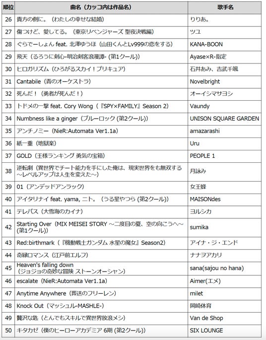 ■通信カラオケDAM 2023年に放送されたアニメ主題歌 楽曲別カラオケランキングTOP50(26位~50位)