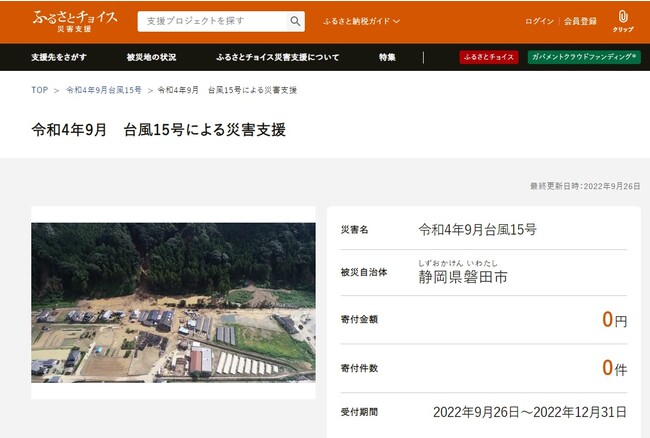 国内最大級のふるさと納税総合サイト「ふるさとチョイス」を企画・運営する株式会社トラストバンク(本社:東京都渋谷区、代表取締役:川村憲一、以下「トラストバンク」)は9月26日、ふるさと納税で被災自治体の災害支援に寄付できる仕組み「ふるさとチョイス災害支援」( https://www.furusato-tax.jp/saigai/ )において、令和4年台風15号により被災した地域の「災害時緊急寄付申込みフォーム」を開設しました。9月26日16時現在、静岡県磐田市への寄付の受け付けを行っています。寄付金は全額、被災地の復旧・復興に使われます。
