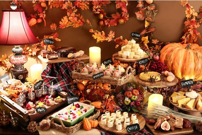 モンブランや濃厚かぼちゃブリュレ、しっとりとしたイチジクのパウンドケーキ、さっぱりとした洋梨のムースなど、秋の実りと彩りを目でも舌でもご堪能いただけるスイーツに加え、カボチャのポタージュスープや秋鮭と茸のペペロンチーノなどの軽食、約20種類を心ゆくまでお召し上がりいただけます。