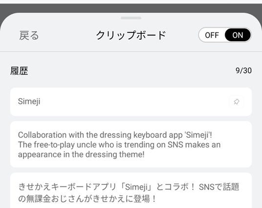 コピーしたテキストを自動で最大30件保存し、過去の履歴からワンタップで即貼り付けが可能です。これにより、頻繁に使用するフレーズや文章を素早く呼び出すことができます。