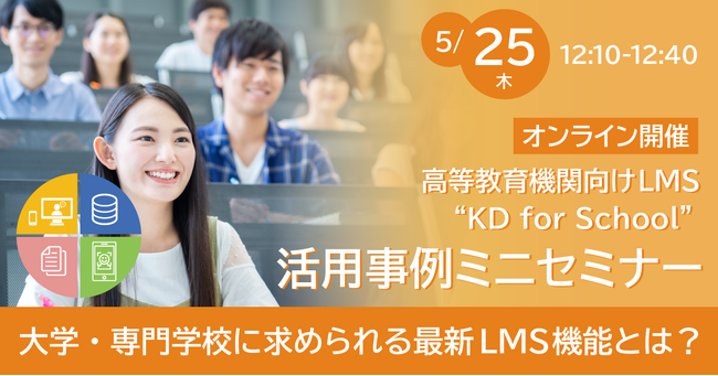 導入実績2000超を誇るeラーニング専門ソリューション企業、株式会社デジタル・ナレッジ(本社:東京都台東区、代表取締役社長:はが弘明)は、2023年5月25日(木)昼、<高等教育機関向けLMS “KD for School”>活用事例ミニセミナー「大学・専門学校に求められる最新LMS機能とは?」をオンライン開催いたします(https://www.digital-knowledge.co.jp/archives/31759/?pr)。また、4月11日(火)開催分も受付中です(https://www.digital-knowledge.co.jp/archives/31543/?pr)。