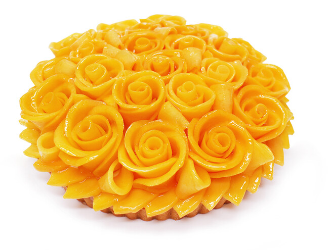 この時期に旬を迎える、とろけるような濃厚な甘みの宮崎県産「完熟マンゴー」を使用し、パティシエが美しいバラに仕上げ、飾りました。国産ならではの、なめらかなマンゴーの極上の美味しさを堪能できます。