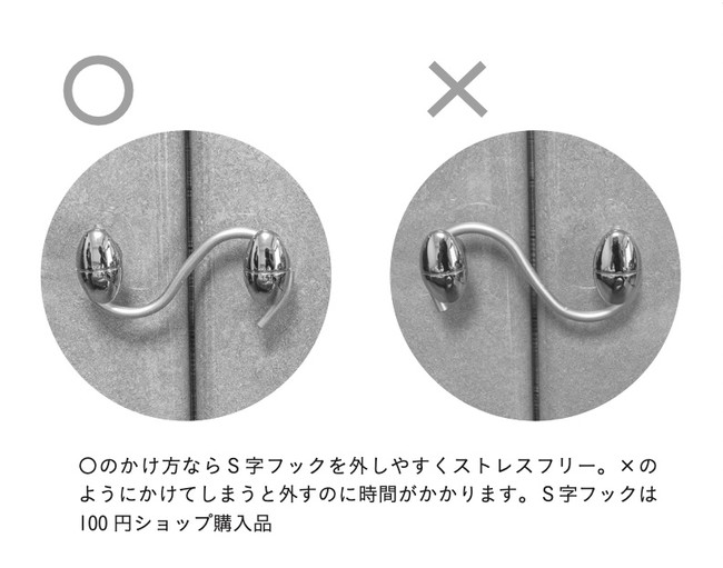 開き戸の取手にS字フックをかませておくだけで、扉が開いて食器や洋服が雪崩のように落ちてくるのを防ぐことができます。